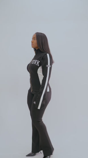Bootcut Knit Pant in Black. Made in our signature compression knit fabric, tailored to lift butt and sculpt curves. Embroidered logo detail. Zipper pockets.